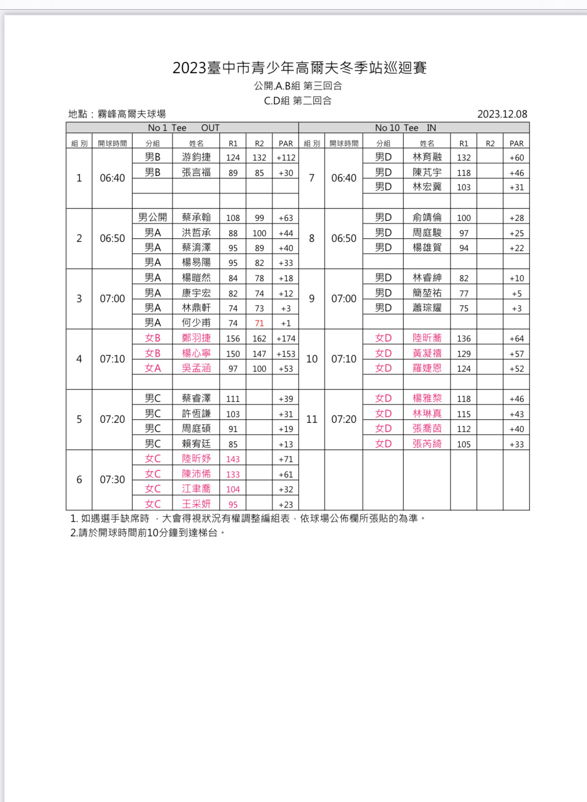 2023台中市青少年高爾夫冬季站巡迴賽_12月8日公開.A.B組第3回.C.D組第二回合編組表
