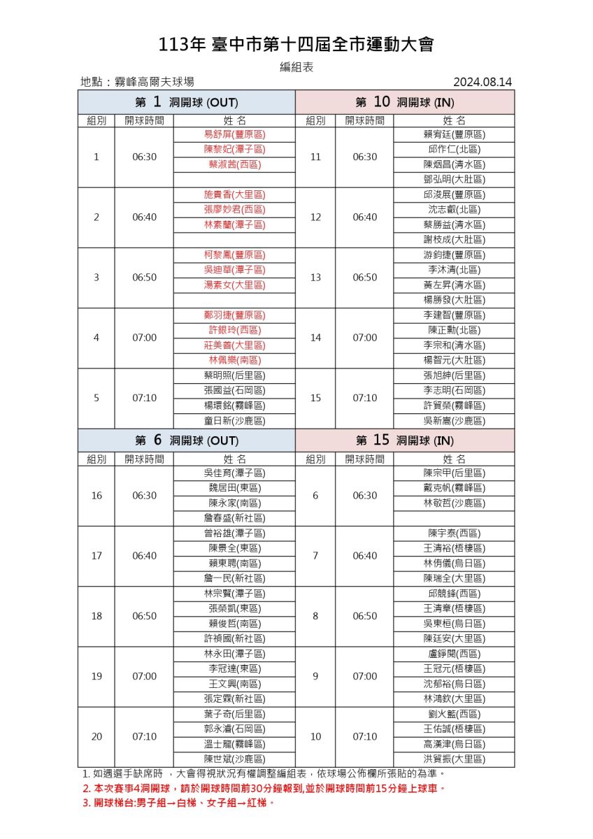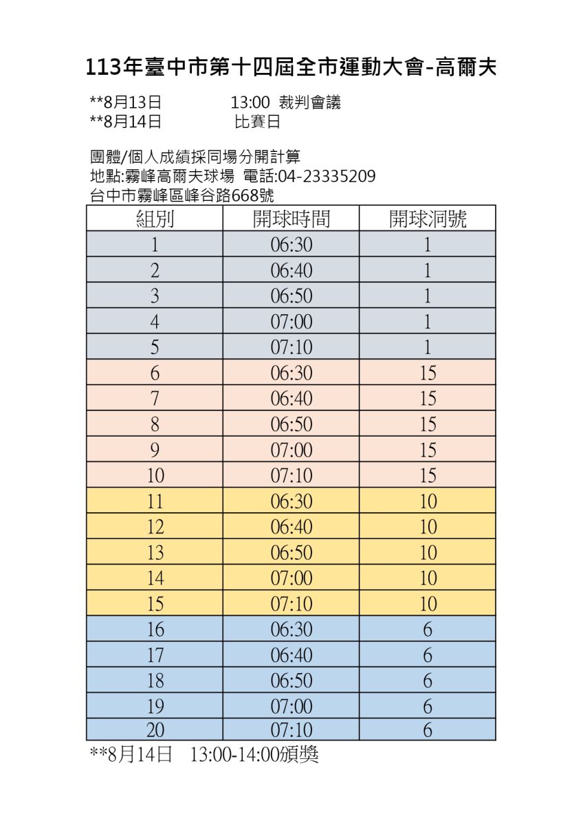 113.8.14臺中市第14屆全市運動大會_高爾夫編組表(霧峰球場)