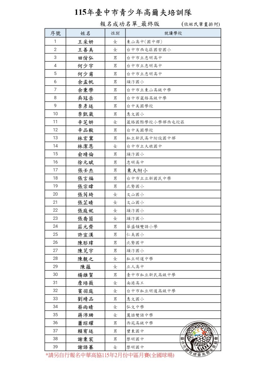 115年「臺中市青少年高爾夫培訓隊培訓隊」-報名成功名單(最終版115.1.12)