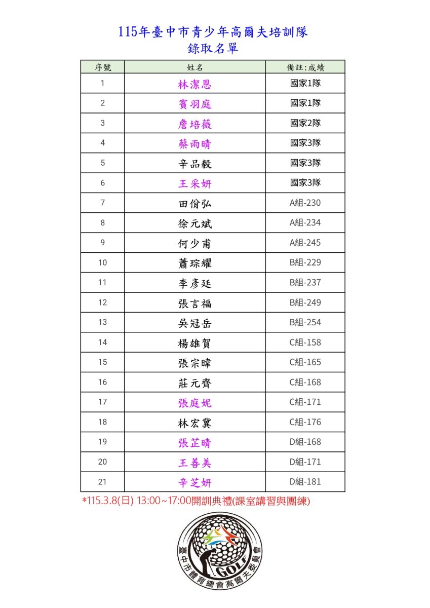 115年「臺中市青少年高爾夫培訓隊培訓隊」錄取名單