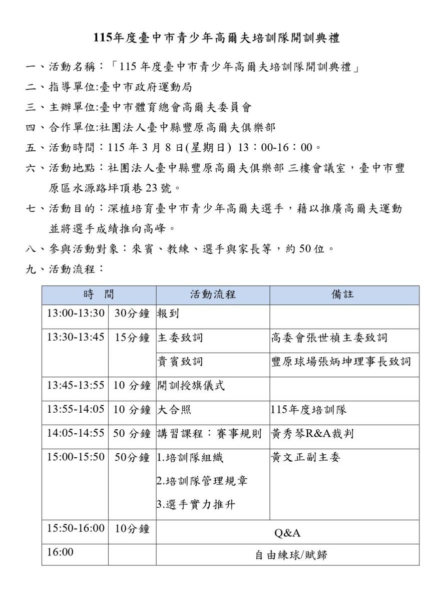 115年「臺中市青少年高爾夫培訓隊培訓隊」開訓典禮活動通知