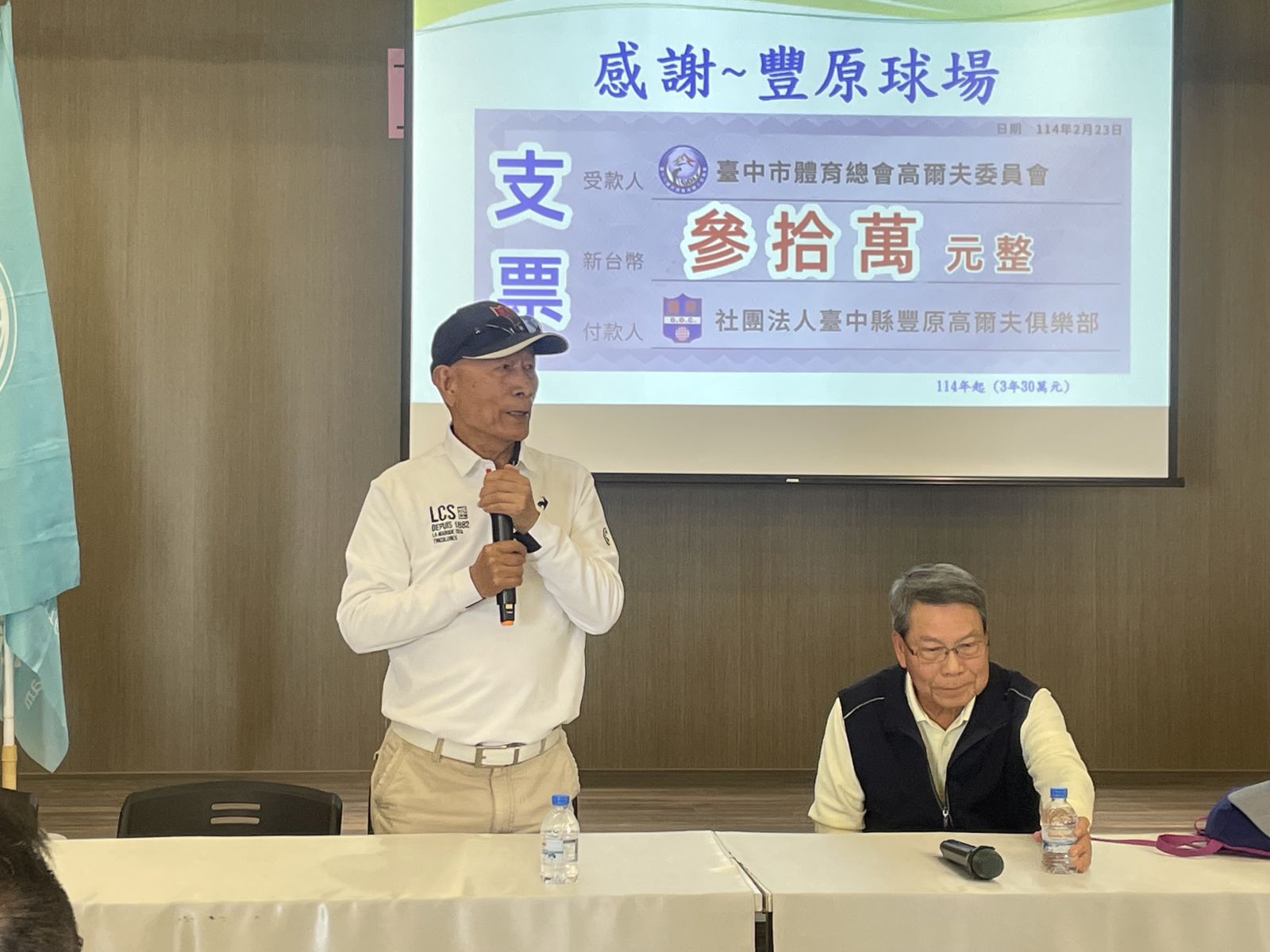隨後由社團法人臺中縣豐原高爾夫俱樂部理事長張炳坤致詞,表達對培訓隊的肯定,更說明提供三年三十萬贊助計畫的實質鼓勵,並期望透過完善的場地與資源,提供選手優質的訓練環境,協助青少年在高爾夫運動道路上穩健成長。
